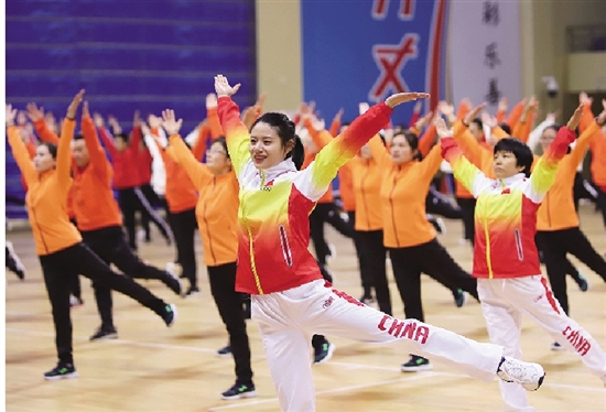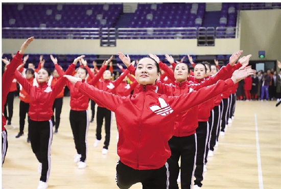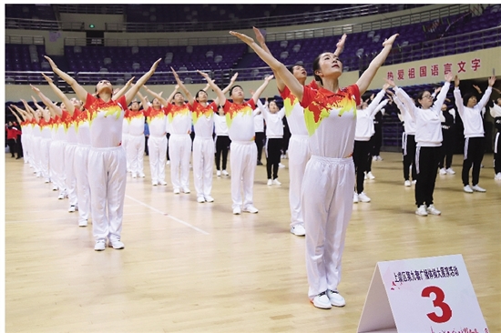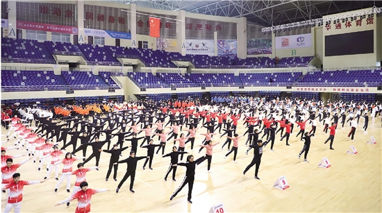 本报讯 (记者 成波 魏新宇 通讯员 于江 文/摄) 12月27日上午,华通体育馆内热力四射,区第九套广播体操大展演活动在这里燃情上演。在《第九套广播体操》欢快的乐曲声中,来自全区各乡镇街道、机关部门、学校(园)的77支代表队同台竞技,1617人分批踏着轻松的节拍,伸展、弯腰、踢腿、跳跃,跳出冬日里的精神活力,舞出新时代的健康风景。