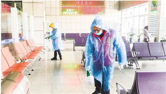 2月3日,上虞交通服务有限公司党员正在客运中心实施消毒作业。连日来,该公司党支部成立的党员防疫队做好对高铁绍兴东站、上虞客运中心、铁路上虞站的日常保洁和每天一次的全面消毒工作。