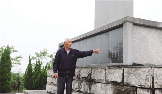 丁国林在丁宅乡革命烈士纪念碑前为采访团讲述革命故事