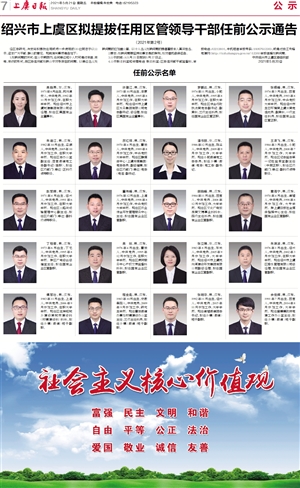 上虞日报 公示 00007 绍兴市上虞区拟提拔任用区管领导干部任前公示通告 2021-05-21 上虞日报2021-05-2100003;上虞日报2021-05-2100004;上虞日报2021-05-2100006;上虞日报2021-05-2100008;上虞日报2021-05-2100010;上虞日报2021-05-2100012;上虞日报2021-05-2100014;上虞日报2021-05-2100016;上虞日报2021-05-2100018;上虞日报2021-05-2100020;上虞日报2021-05-2100022;上虞日报2021-05-2100024;上虞日报2021-05-2100026;上虞日报2021-05-2100028;上虞日报2021-05-2100030;上虞日报2021-05-2100032;上虞日报2021-05-2100034;上虞日报2021-05-2100036;上虞日报2021-05-2100038;上虞日报2021-05-2100040;上虞日报2021-05-2100042;上虞日报2021-05-2100044;上虞日报2021-05-2100009;上虞日报2021-05-2100004;上虞日报2021-05-2100012;上虞日报2021-05-2100015;上虞日报2021-05-2100019;上虞日报2021-05-2100020;上虞日报2021-05-2100002;上虞日报2021-05-2100001;上虞日报2021-05-2100014;上虞日报2021-05-2100008;上虞日报2021-05-2100007;上虞日报2021-05-2100003;上虞日报2021-05-2100006;上虞日报2021-05-2100011;上虞日报2021-05-2100017;上虞日报2021-05-2100010;上虞日报2021-05-2100013;上虞日报2021-05-2100018;上虞日报2021-05-2100005;上虞日报2021-05-2100016 2 2021年05月21日 星期五
