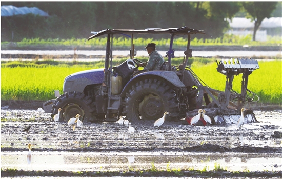 芒种将至,农民抢抓农时翻耕土地、播种育秧,在田间辛苦劳作。图为机耕手正在上浦镇东山村的农田里耕田,四周鹭鸟飞舞觅食。