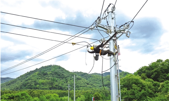 | “蜘蛛网”整治 连日来,舜兴电力加紧实施陈溪乡电力线路改迁作业,将纵横交错的强弱电线路改道,彻底解决“景区蜘蛛网”顽疾,助力4A级景区打造。 图为6月3日,陈溪乡管溪边,电力工人正在登高作业。 记者 朱胜钧 通讯员 谢锦 摄 |