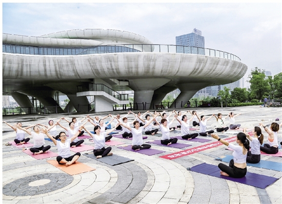 6月21日是国际瑜伽日,当天,上虞一瑜伽学院组织学员在城市阳台开展瑜伽日公益表演活动,向市民展示灵动与美感。 记者 朱胜钧 王淋玲 摄