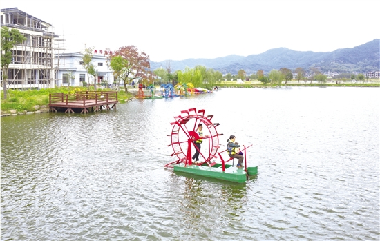 近日,梁湖街道西华瑶村瑶池湿地公园景色宜人,吸引了众多游客划船赏景。