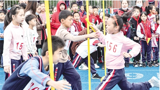 近日,全区各校纷纷开展秋季运动会,学生们通过体育成果展示和体育竞技项目比赛,尽享体育运动带来的乐趣。图为章镇镇王充小学举行的全镇小学生运动会上,运动员正在进行迎面接力比赛。
