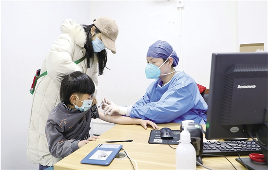 1月15日,一名学生趁周末在百官街道江与城临时接种点接种新冠疫苗。