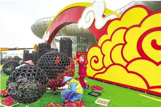 1月27日,曹娥江畔城市阳台,工人正在加紧布展,迎接即将到来的农历新年。