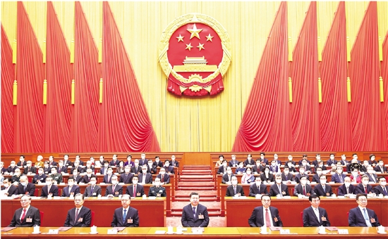 | 3月11日,第十三届全国人民代表大会第五次会议在北京人民大会堂闭幕。党和国家领导人习近平、李克强、汪洋、王沪宁、赵乐际、韩正、王岐山等在主席台就座,栗战书主持闭幕会并发表讲话。 新华社记者 黄敬文 摄 |
