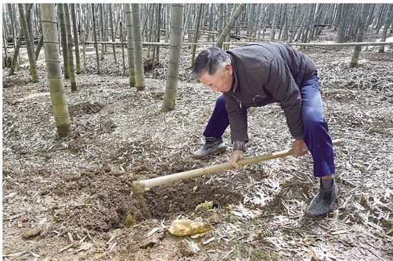 长塘镇有1.5万亩竹山,随着天气逐渐转暖,春笋开始小批量上市,当地农民正抢抓时机挖掘春笋。据农户介绍,目前的春笋还是“时鲜货”,收购价大约5元一斤,不久后将大批量上市。图为笋农在长塘镇桃园村竹山上挖春笋。 记者 朱胜钧 摄