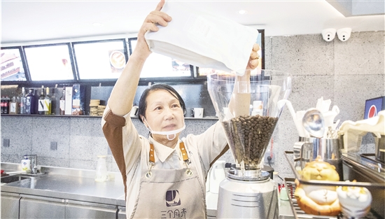 3月19日,岭南乡青山村65岁的徐爱红正在咖啡机前为游客制作咖啡。她是个地道的农民,在经过一个多月培训后成功变身咖啡师,在三个月亮乡村咖啡馆上岗。