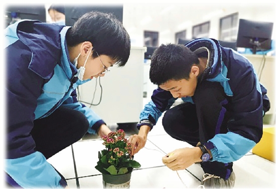 紧接着,“华维园智能路灯”“铁路桥那缤纷灯带”“声控温度计”“植物管家”等项目纷纷进入信息技术课堂……于是,每位学生俨然成为了一位位设计大师,热烈分析起项目功能,细心挑选着所需硬件;那两位同学一起合作着搭建硬件,边动手边讨论传感器的引脚问题;每组学生正精心设计实现功能的程序代码。