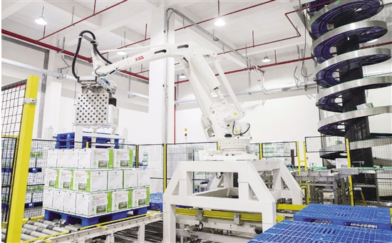 4月2日,在位于杭州湾上虞经开区的永农生物科学有限公司,全自动机器手臂正在堆放农药,生产线从理瓶、灌装、旋盖、封口、喷码、贴标、装箱到堆垛实现了全自动一体化生产。
