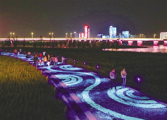 近日,城区“一江两岸”三期景观带建成开放,两岸霓虹灯变幻无穷,美轮美奂的夜景吸引市民休闲观光,又为虞城百姓增添了一个休闲散步的好去处。 记者 魏新宇 摄