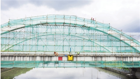 日前,百悬线丰惠镇余姚江上公路桥,工人正在加紧进行翻新加固作业,确保大桥安全美观。