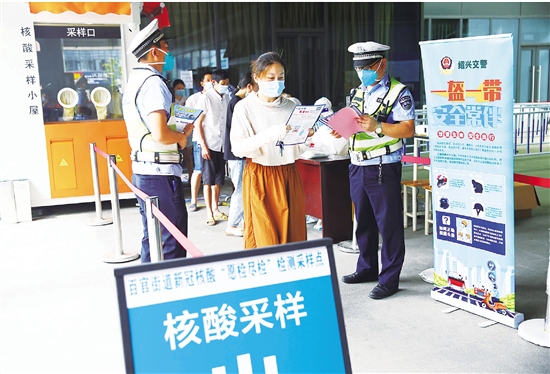6月16日,南丰邻里中心核酸检测点,百官街道梁江社区“社区交警”正在派发“一盔一带”宣传单。他们通过张贴交通安全宣传“一米线”、投影仪播放典型事故案例等多种形式,向社区居民普及交通安全常识,讲解闯红灯、人车抢行、骑乘摩托车和电动车不戴安全头盔等交通违法行为的危害性,提高社区居民的交通安全意识和法律意识,筑牢交通安全防线。