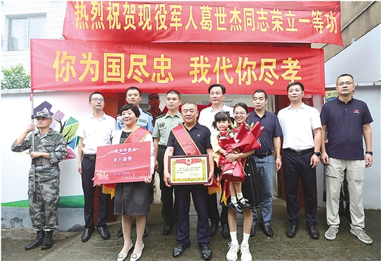 本报讯 (见习记者 章敏) 9月2日下午,绍兴市军分区政治工作处、绍兴市退役军人事务局相关领导和我区相关领导一起赴丰惠镇永庆村为荣立一等功现役军人葛世杰家庭送去喜报、牌匾、奖金,进一步弘扬新时代拥军优属光荣传统,营造“一人参军,全家光荣”的浓厚氛围。