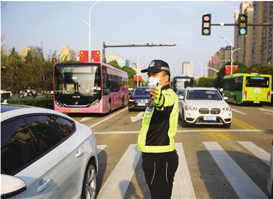 连日来,区公安交警部门全力以赴做好国庆期间道路交通安全管理工作,为群众出行营造安全、畅通、和谐的道路交通环境。图为昨日,交警在城北市民大道指挥疏导交通。