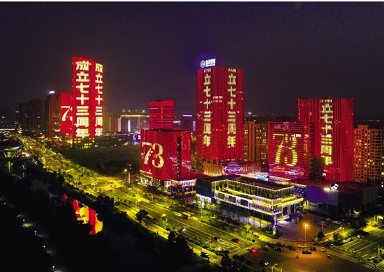 9月30日晚,一江两岸沿岸楼宇纷纷亮起璀璨灯光,鲜艳的五星红旗映衬在高楼幕墙上,曹娥江畔流光溢彩,满眼尽是中国红,一派喜庆气氛。