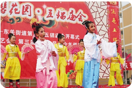 这些年,学校定期举办“五猖庙会”,设置民俗走街表演、创意灯笼展示、地方曲艺秀等特色环节,尤其是在备受关注的庙会才艺秀上,学生们精心演绎一个家乡地方特色节目已成为庙会秀的传统:或淳朴高亢的绍剧独唱,或幽默风趣的滑稽故事,或悠扬婉转的越剧表演,或耳目一新的方言歌舞、嗨翻全场的莲花落戏曲……让在座师生以及前来观看的东关老百姓们感受家乡文艺魅力的同时,也传承了以“五猖庙会”为核心的东关地理环境、历史文化、风土人情、名人雅士和民间技艺等文化遗产,引导学生、老百姓们追寻家乡的文化之根。