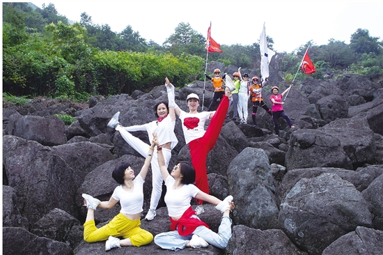 游客在覆卮山石浪上摆造型合影。