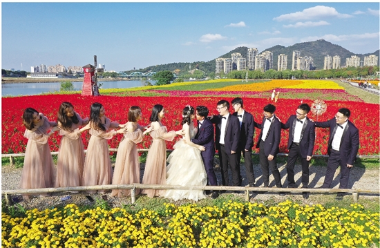 曹娥江畔的花海里,一对新人在伴郎伴娘的簇拥下拥抱。
