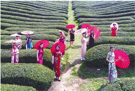 旗袍爱好者在章镇镇张村村茶园里秀旗袍拍美照。
