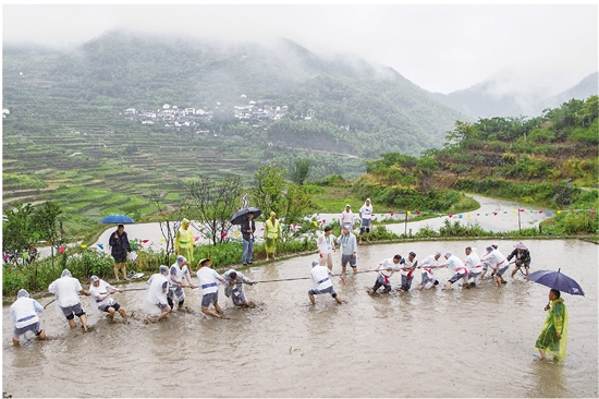 游客和村民在岭南乡东澄村覆卮山千年梯田开展拔河比赛。