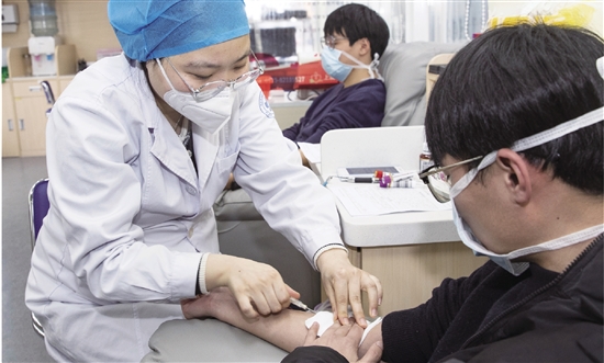 1月5日,区采供血点万达广场爱心献血屋,医护人员正在为自发前来献血的热心市民采血。