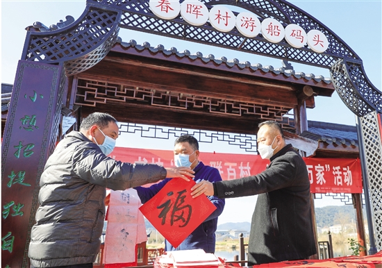 本报讯 (通讯员 俞楠 记者 金伟) 艺心联百村,送福进万家。春节前夕,由区文联主办、区书法家协会承办的文艺志愿服务走进盖北镇兴海村、驿亭镇春晖村等多地,为当地老百姓送上春联,将美好的祝福送到群众手中。