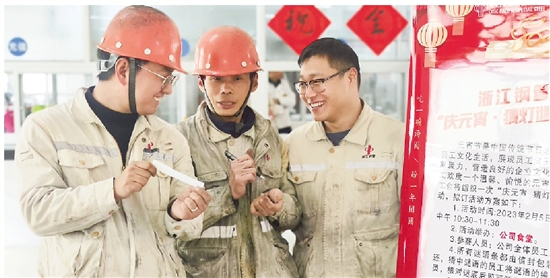 2月5日,位于小越街道的浙江泰富无缝钢管有限公司,工人们正在猜灯谜。