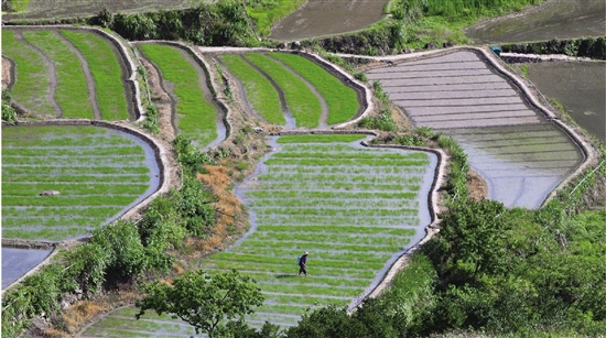 5月30日,岭南乡覆卮山梯田,农民正在给单季晚稻秧苗施肥。覆卮山梯田经过一轮油菜收成之后立刻转入晚稻栽培模式,耕田、注水、育秧工作相继开展,有效提高农田利用率,确保增产增收。