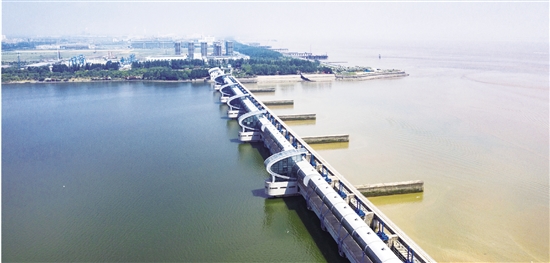 6月9日,无人机镜头下的曹娥江口门大闸如巨龙盘卧,横跨在曹娥江的入海口两端,将钱塘江潮水紧锁在外,形成“内冷外热”奇妙景观。