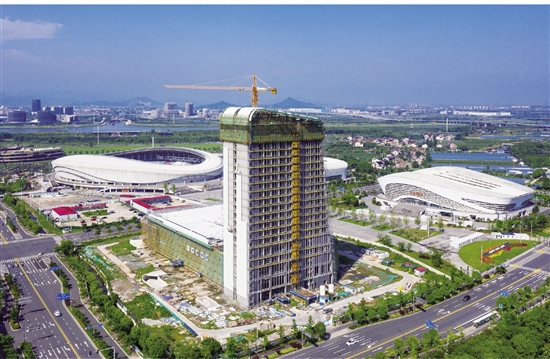 6月9日,上虞体育中心建设工地上一派繁忙景象,工人正对大厦幕墙进行施工,内部装修也陆续展开。