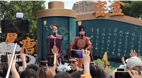 “《西游记》中九九八十一难,第一难是什么?”“不知道,不要紧,来,拍个照。”大唐不夜城中,两位身着古装的演员,分别扮演唐代名人房玄龄和杜如晦,出题与游客进行互动,幽默风趣的提问和回答引得台下观众不时发出阵阵欢笑。这就是近期持续火爆的西安大唐不夜城互动节目“盛唐密盒”,全新的互动形式引得全国各地游客纷纷慕名前来“答题”。