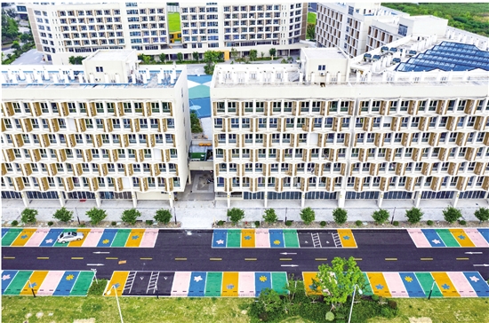 日前,位于曹娥江西岸e游小镇门户客厅的青春公寓展现青春靓丽的色彩,彩色的停车位、彩色的公共活动空间给人耳目一新的感觉。