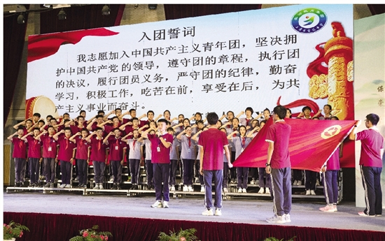5月30日,实验中学新团员正在团旗前庄严宣誓。当晚,实初教育集团实验中学联合小越街道中学、上浦镇中学、汤浦镇中学、金融街杭州湾学校隆重举行“诵读文学经典 竞展青春芳华”为主题的离队入团仪式暨师生亲子同台诵经典活动。《唐诗中国,诗路曹娥》《青春中国之我们》《今在上虞》《我心中的这座城》等10余台美文诵读节目精彩纷呈。此次活动不仅传承和弘扬了中华经典文化,也激励青少年学生要争做爱国、爱党、爱家乡的新时代好少年。 记者 朱胜钧 摄