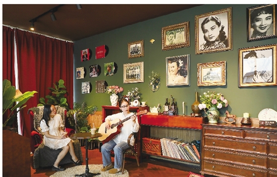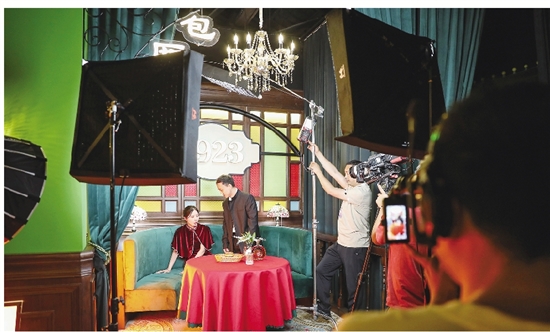 缓缓流淌的宋景河,仿佛诉说着岁月的流逝,白墙黑瓦间,一条不起眼的小弄里,坐落着晋生星片场。走入其中,一股民国风扑面而来。“百乐门”“金粉公馆”“感光照相馆”……在一个个交错的电影主题空间中,我仿佛看到了一个个婀娜多姿的女影星们,搽着粉,持着扇,身着旗袍,穿过了时空,从一张张黑白底的相片中向我们走来。这就是谢晋为我们带来的摩登与时尚,光鲜与华丽。