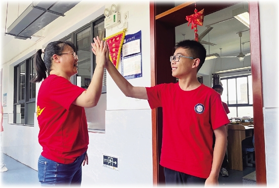 6月22日上午,竺可桢中学校领导及九年级全体班主任老师面带微笑,送考生们进考场;每个班级门口,考生们都纵身一跃摸到“状元”粽;班主任给考生们幸运的拥抱,并送上美好的祝愿,场面温馨而感人。