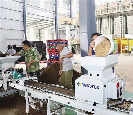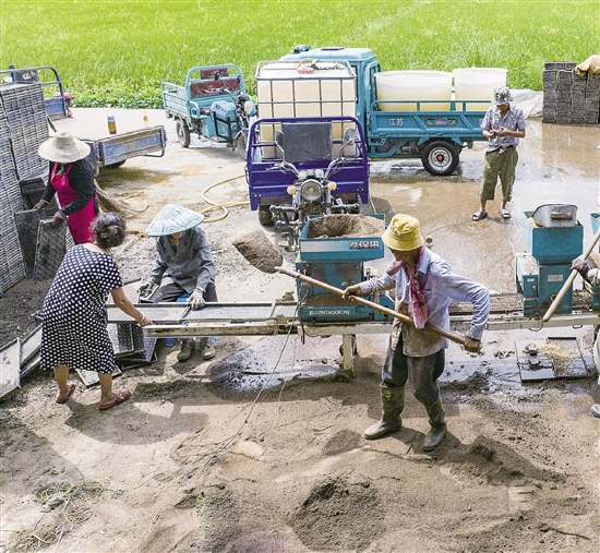 位于东关街道的三丰富硒粮油专业合作社内同样一片繁忙景象,工人正将育秧盘、育秧基质、种子整齐放入生产线。