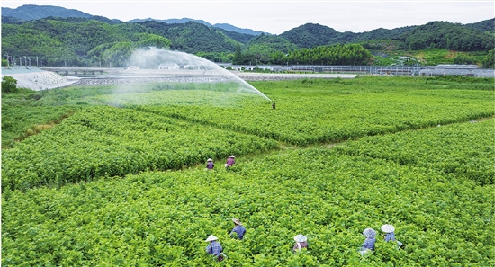 7月19日,丁宅乡丁宅村大片可食用桑叶进入采摘期。当地农户或操作自动灌溉系统浇灌,或娴熟地采收桑叶。连片茂密的桑田和田间忙碌的农户,构成一幅美丽的夏日田园画卷。
