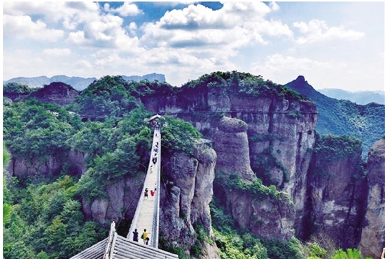 我们先坐上北山的索道。索道带着我们摇摇晃晃地上了山。我们在半空中看着起伏不平的山峰,不禁充满了期待。来到了瀑布群,可以看到原本叮叮咚咚从山上流淌而下的泉水,在这儿猛地从几百米高空一泻而下,飞溅在山石上,炸裂成无数朵晶莹剔透的水花,发出银铃般的脆响。瀑布好似一条悬挂在山间的银链,从高高的山上蜿蜒而下,将青山绿水装点得更加妖娆多姿,璀璨极了。流水声如同一首欢快的乐曲,让人陶醉于大自然的神奇魅力。