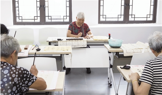 8月29日,小越街道福越孝德乐龄中心内一派热闹景象,老年居民欢聚一处,或看剧、练书法,或自制养身锤、玩纸牌游戏,或接受医生的日常健康检查,其乐融融。