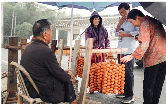 眼下正值柿子成熟季,在长塘镇桃园村,金黄的柿子挂满枝头,尽显山村秋韵。村民们忙着把柿子制作成串、包装发货,不少游客与村民慕名前来购买,祈愿 “柿柿如意”。