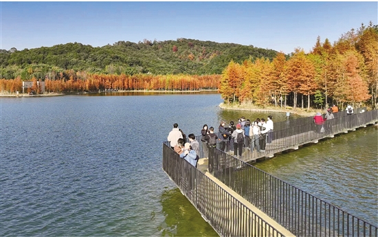 据不完全统计,上周末慕名前来上虞瓷源文化小镇凤翎湖观光的游客突破千人次。游客们沉醉于湖光山色与火红杉林交织的美景之中,感受大自然的独特魅力。
