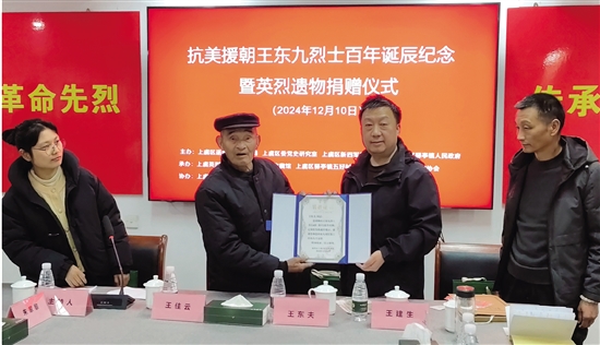 上虞红色收藏馆馆长向王东夫(左二)颁发捐赠证书。通讯员 李金海 摄
