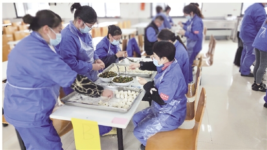 活动现场,大家摆好长桌,早早备好了馅料、面团,大家拿起饺子皮,填上满满的馅料,双手一捏一折,精致的饺子就成形了。当一盘盘热腾腾的饺子摆满桌,劳动成果化作舌尖美味,暖了胃更暖了心。