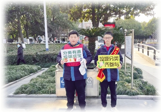 学生们佩带“阳光志愿者”绶带,拿着抹布水桶,对学校附近垃圾桶进行清洁,并且手举一块块写着“垃圾分类齐参与”等字样的牌子,向周边市民宣传垃圾分类,展现青少年的社会责任感。 通讯员 金世杰 摄