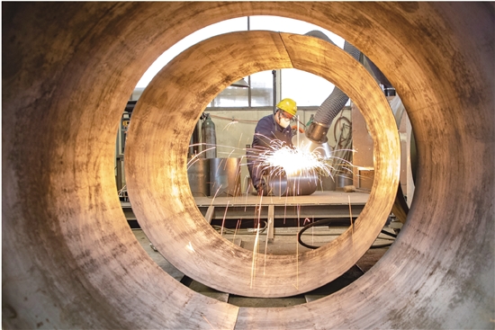 浙江聚英风机工业有限公司,工人正在加工风机部件。