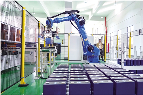 曹娥江新型智能电源装备研发制造垂直产业链基地,机器人正在搬运新能源电源系统组件。