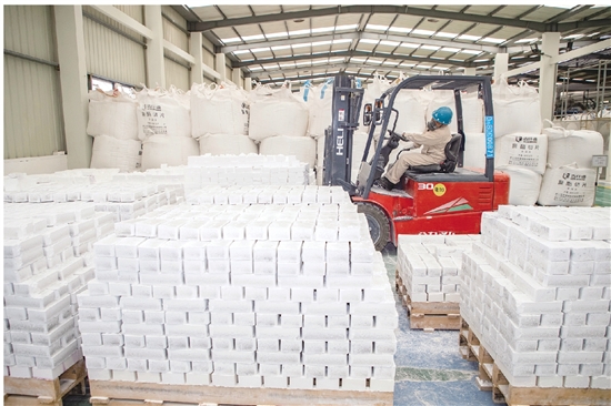 浙江自立高温科技有限公司氧化铝半成品仓库,工人正在搬运物料。